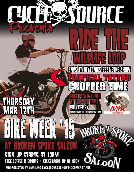Registrations start at 10am, Kickstands up at Noon . Join us as we gather at the Broken Spoke Saloon starting at 10am for coffee and doughnuts. Kickstands up at noon for a brisk ride through the Wild Life Loop that will go down the beach and end at Willie's Tropical for the Chopper time Show. Riders get a free picnic style lunch at Willie's by the Arni Foundation.
